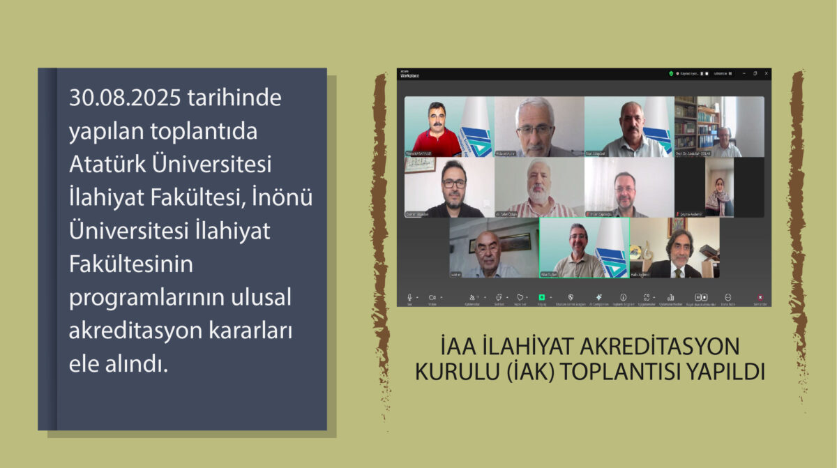 İAA İlahiyat Akreditasyon Kurulu (IAK) toplantısı 30.08.2025 tarihinde gerçekleştirdi. Prof. Dr. Fikret Karapınar başkanlığında gerçekleştirilen toplantıda; Atatürk Üniversitesi İlahiyat Fakültesi normal öğretim ilahiyat programı, İnönü Üniversitesi İlahiyat Fakültesi normal öğretim ilahiyat programlarının akreditasyon kararları görüşüldü.