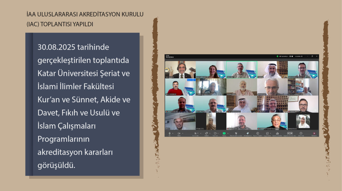 İlahiyat Akreditasyon Ajansının (İAA) Uluslararası Akreditasyon Kurulu (IAC) toplantısı 30.08.2025 tarihinde gerçekleştirildi. Prof. Dr. Ahmet Türkan başkanlığında yapılan toplantıda; Katar Üniversitesi Şeriat ve İslami İlimler Fakültesinin Kur’an ve Sünnet, Akide ve Davet, Fıkıh ve Usulü ve İslam Çalışmaları programlarının akreditasyon değerlendirme sonuçları karara bağlandı.